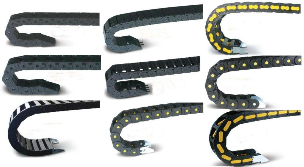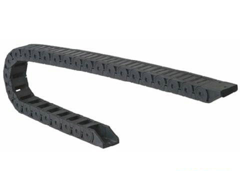 單元鏈節(jié)由左右鏈板和上下蓋板組成,尼龍拖鏈每節(jié)都能打開,裝拆方便,不必穿線,打開蓋板后即可把電纜、油管、氣管等放入拖鏈內(nèi)。