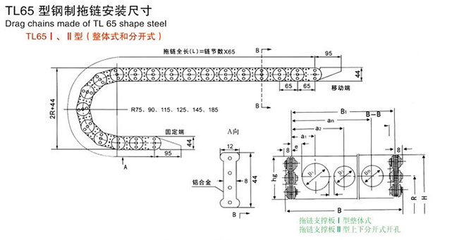 TL65型鋼制拖鏈安裝尺寸:2R+44(R=75/90/115/125/145/180); 拖鏈全長(L)=鏈節(jié)數(shù)x65; 鋁合金:44;拖鏈支撐板:I型整體式和II型上下分開式開孔
