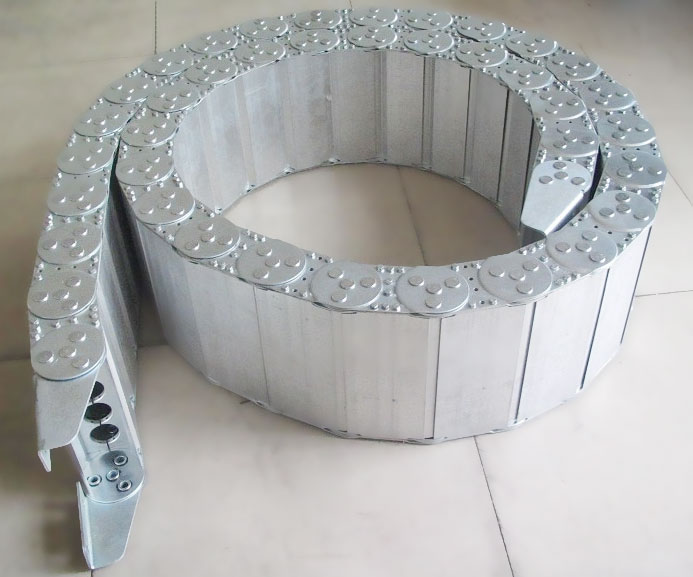 TLA型鋼鋁拖鏈可承載數(shù)量多,重量大的電纜及油管,自由懸置(允許不用支承輪)長度大,支撐板可根據(jù)用戶需要制作,適用于工作母機(jī),移動(dòng)要械等。其彎曲半徑為50-600mm,鏈板高度為35-150mm,可任意選用。
