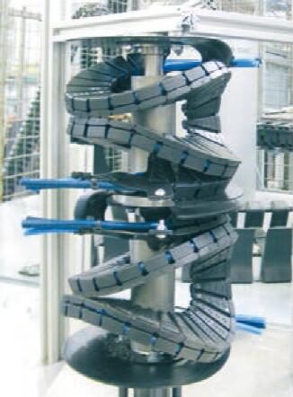 閔彬可提供做最大 540°的旋轉(zhuǎn)運(yùn)動(dòng)的導(dǎo)向槽模塊化系統(tǒng)。這個(gè)系統(tǒng)分為內(nèi)圈和外圈。其中一圈與拖鏈連在一起,拖鏈與槽之間沒有相對(duì)運(yùn)動(dòng),所以摩損可降至最低。根據(jù)應(yīng)用環(huán)境,導(dǎo)向槽的材料為鍍鋅鋼或不銹鋼。