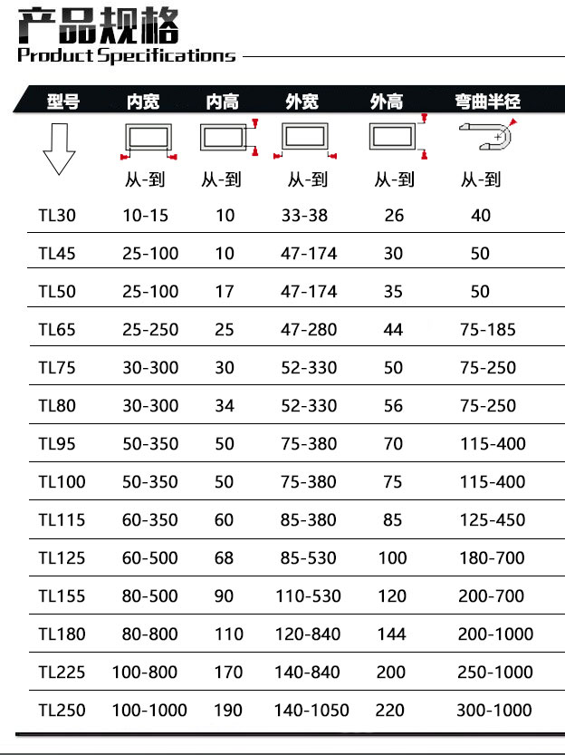 ◆適合于使用在往復(fù)運(yùn)動(dòng)的場(chǎng)合,能夠?qū)?nèi)置的電纜油管、氣管,水管等起到牽引和保護(hù)作用。