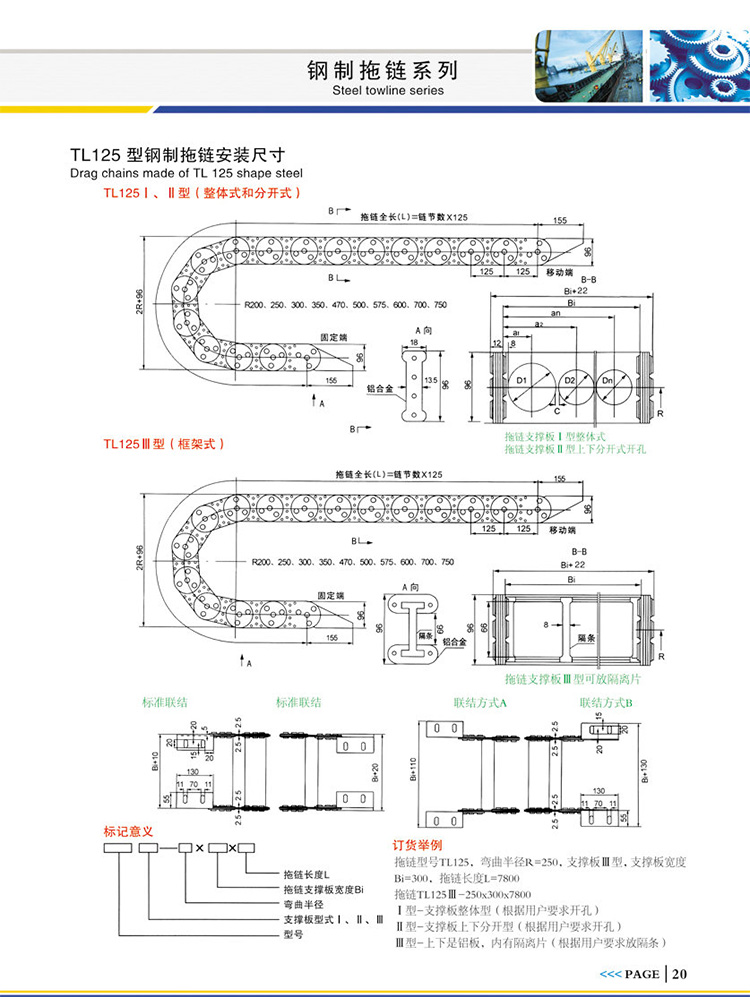 拖鏈型號(hào)TL125,彎曲半徑R=250,支撐板Ⅲ型,支撐板寬度Bi=300,拖鏈長度L=7500