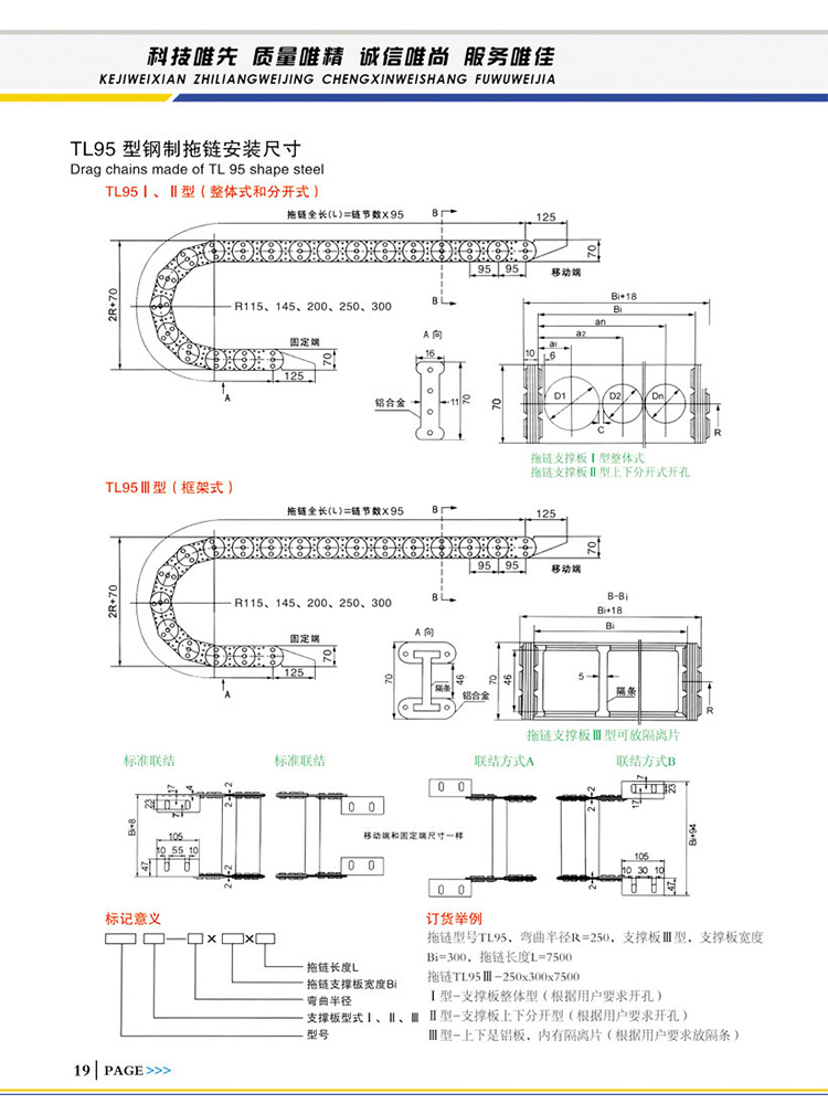 拖鏈型號(hào)TL95,彎曲半徑R=250,支撐板Ⅲ型,支撐板寬度Bi=300,拖鏈長度L=7500