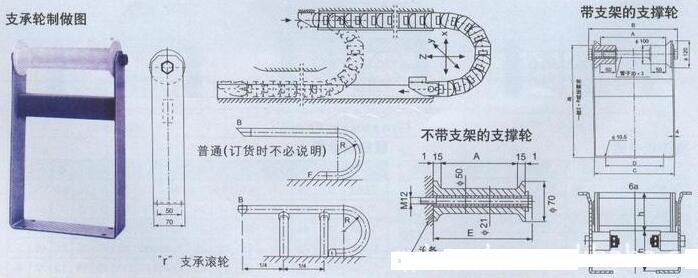 鋼制拖鏈設(shè)計(jì)參數(shù):節(jié)距,彎曲半徑,拖鏈寬度,拖鏈長(zhǎng)度,支撐板形式。